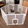The Petyard Passage® is a safe, portable containment area which features an exclusive swinging door for pets. The 9.5" x 8" door swings freely allowing your pet the freedom to come and go as they please. Want to contain your pet - no problem. The small door also locks for containment offering you peace of mind. Perfect for households with puppies or multiple pets. The Petyard Passage encloses up to 18.5 sq. ft. of space and is 26" high. Increasing or reducing the size of your Petyard is easy, simply add or remove panels for multiple configurations for all stages and phases of your pet’s life. Adding a Two-Panel Extension (sold separately) will increase the size of your Petyard to 34.4 sq. ft. To make a cozy crate for a small dog or puppy, simply remove two panels. The Petyard Passage folds up easily and comes complete with a carry strap. Weather resistant and portable, the Petyard Passage can be used just about anywhere. Hardware Mount: The six-panel play yard can now act as an extra-wide barrier with the use of a Superyard Wall Mount Kit. It's the perfect solution for homes with open floor plans or large spaces that need blocking off. Fits openings from 38 1/2 inches to over 16 feet wide. Proudly made in the USA.