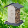The Large Pinecone Hopper Style birdfeeder is part of an extensive Village Collection of feeders. This hanging hopper birdfeeder is crafted out of lightweight plastic for strength and durability. Measuring 8.25 x 8.25 x 11 inches high, this feeder holds 4.25 lbs. of your favorite seed. For monitoring seed levels, the center chamber has two clear window panes. To fill the feeder, simply lift up the roof. This birdfeeder displays a nature-inspired pinecone design on the side panels adding to the whimsical charm of the feeder. Proudly Made in the USA.