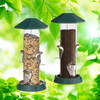 The 2-in-1 Hinged-Port birdfeeder adds a pop of color to the outdoors. The hunter green roof has a raised shingle design for authenticity. Measuring 12.5 inches high, this feeder has the capacity to hold 1.5 lbs. of seed. The center tube is made of clear durable plastic to monitor seed levels. TheĀ four feeding stations have a hinged-port that flip up to feed thistle or flip down to feed wild bird seed. The seed tray at the base of the feeder has a colorful textured pattern and is the perfect place for birds to perch.