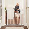 The name says it all – Ultimutt Walk Thru Pet Gate with Auto Close from North States is the ultimate pet safety gate for both day and night. The innovative glow-in-the-dark feature illuminates the large easy-grip handle, allowing you to see and open the gate in the dark. This gate easily pressure mounts between rooms, hallways or doorways keeping your pet contained in their own space. The extra-wide 22″ door on this gate provides plenty of room to walk through with ease. The door motion is effortless; the gravity-fed auto-close door allows the gate to shut firmly and gently behind you. For those times when you want the gate to quickly remain open, just move the door past 90 degrees and the hold-open feature will kick in. The crisp white finish of this dog gate will blend seamlessly with any home decor, while its heavy-duty steel construction is chew-proof and built to last! This gate fits openings from 29.75 to 37.5 inches wide with two extensions included and is 30 inches high.