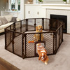 The Petyard Passage® is a safe, portable containment area which features an exclusive swinging door for pets. The 9.5 x 8 door swings freely allowing your pet the freedom to come and go as they please. Want to contain your pet-no problem. The small door also locks for containment offering you peace of mind. Perfect for households with puppies or multiple pets. The eight-panel Petyard Passage is brown in color and encloses up to 34.4 sq. ft. of space, or almost 7 feet across corner to corner and is 26" high. Right out of the box, setting up the Petyard Passage is easy, the eight interlocking panels are pre-connected--simply pull the panels out of the box, unfold and connect them together. Comes complete with skid-resistant pads, won't slip or scratch, works on any surface. The Petyard Passage also includes a convenient carry handle which makes this lightweight yard easy to take anywhere, indoors or outdoors. Want to reduce the size of your Petyard-simply remove panels for multiple configurations for all stages and phases of your pet’s life. Remove two panels to make a hexagon shaped pen for your pet to play with ease. Remove two additional panels to create a cozy crate for puppy training. The versatility of this yard is endless. Proudly Made in the USA.