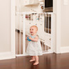 The Toddleroo by North States® Tall Bright Choice Auto-Close Gate assures you'll keep you and your baby safe day or night. The innovative glow-in-the-dark feature on this child gate illuminates the large easy-grip handle, giving parents the capability to see and open the gate in the dark. This safety gate pressure mounts between rooms, hallways or doorways. Its extra-wide 22" door provides plenty of room to walk through with ease and gravity-fed hinge effortlessly closes it behind you. For those times when you want the gate to quickly remain open, just move the door past 90 degrees and the hold-open feature will kick in. To control the direction that the gate moves, a swing control knob allows you to decide – easily pivot in one direction or both directions when needed. The Toddleroo Tall Bright Choice Auto-Close gate has a crisp white finish that will complement any home décor, while its heavy-duty steel construction is built to last! Ideal for a variety of room openings or at the bottom of stairs measuring 29.75 to 40.5 inches wide with two extensions included and is an extra-tall 36 inches high. Every Toddleroo by North States baby gate is Baby Safety Alliance and ASTM certified. Need to make the gate even wider? The Tall Bright Choice Gate has two additional extensions (sold separately). The 5.5 inch extension is available under product number 5331, and the 11 inch extension is available under product number 5332.